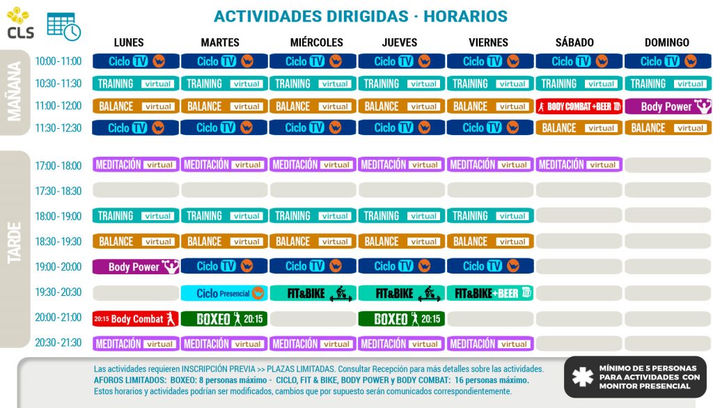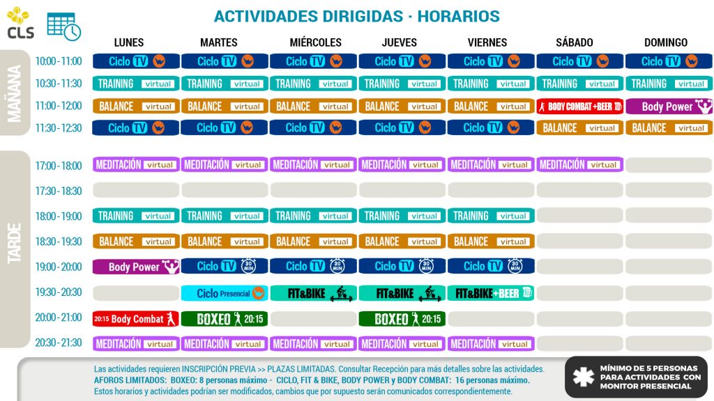 Consulta en esta sección los horarios de apertura del club y en un segundo cuadro los horarios de las actividades dirigidas indoor y las salas correspondientes. Este calendario puede sufrir modificaciones por lo cual no dejes de consultarlo!
